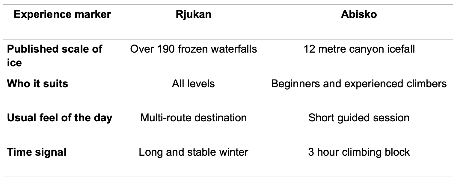 The climb sits inside a guided frame and a strong natural setting, which can be ideal for someone who wants the sharp feeling of real ice without needing a full valley of options. In simple terms, Rjukan is stronger for climbing mileage. Abisko is stronger for a compact Arctic ice experience.